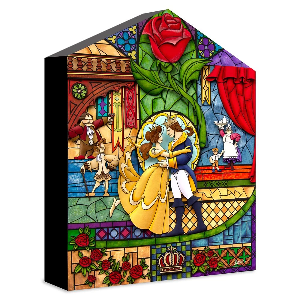 A stained glass window from Beauty and the Beast features Belle and a host of the enchanted characters in their human form on this giclée on canvas by Karin Arruda. Our limited edition ”Our Fairytale” comes gallery wrapped and includes a certificate of authenticity.