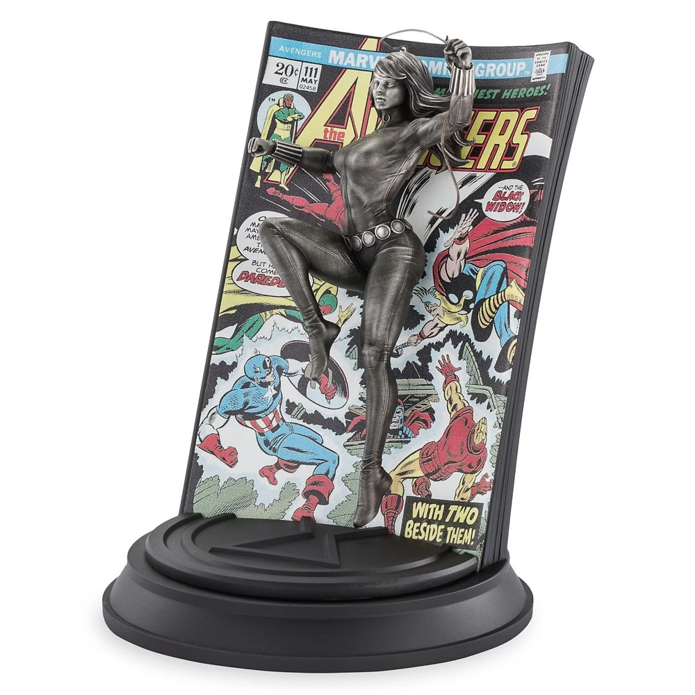The X-Men and most of the Avengers have come under the control of Magneto, who holds them prisoner in his secret lair. Enlisting the help of super spy Natasha Romanoff, otherwise known as the Black Widow, the remaining Avengers discover and attack Magneto, freeing all the captives. An issue significant for her officially becoming a member of the Avengers, illustrator Alan Quah and sculptor Ghim Ong reimagine the Black Widow in glorious 3D, flying out of John Romita, Joe Sinnott and Gaspar Saladino’s punchy 1973 cover art in this finely detailed pewter figure from Royal Selangor.