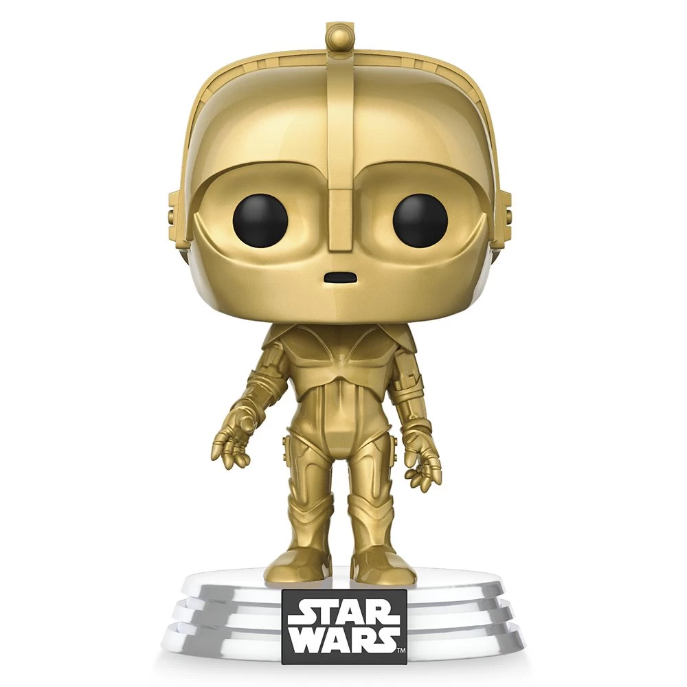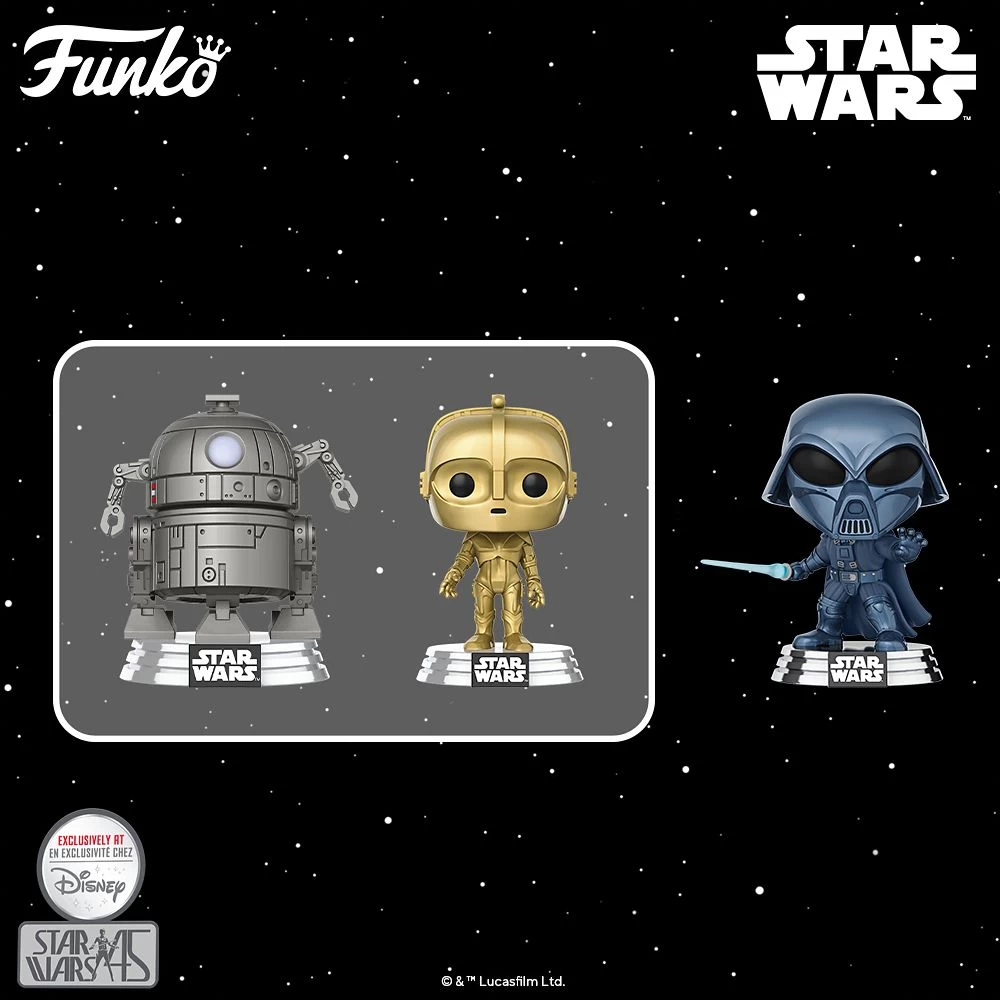 In celebration of the 45th anniversary of Star Wars: A New Hope, those lovable droids C-3PO and R2-D2 have been reunited in this Pop! Vinyl bobble-head figure set by Funko. Exclusively available to Disney, these figures come in retro-style packaging, and each on their own Star Wars base.
