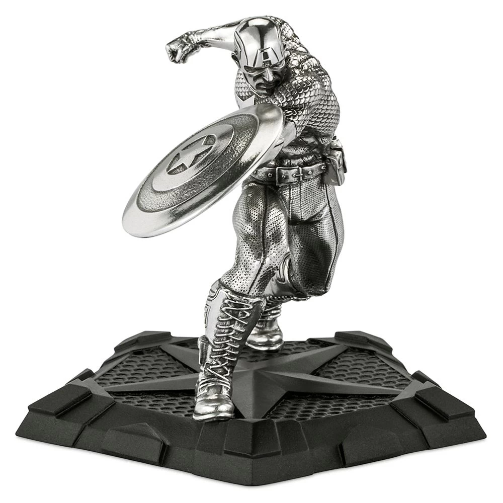 Shield in hand, Captain America charges forward and readies to throw a devastating punch in one fluid move. Finely detailed in pewter, the sculpture is rendered in the dynamic style and distinctive costume of the Bronze Age of comics and features the First Avenger on a plinth that echoes his signature five-pointed star insignia.