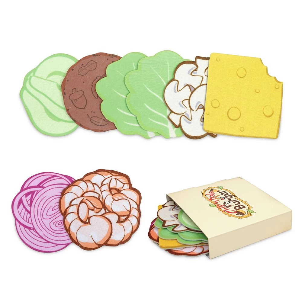 - Diner items include: two lettuce buns, nut patty, avocado slide, mushroom slice, onion slice, cheese slice, shrimp, three french fry bundles, six chicken strips, burger sleeve, fry box, chicken box, two napkins, two cups, two cup sleeves, two straws, and two place mats