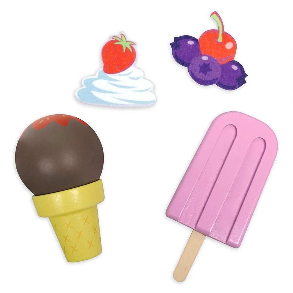 - Café items include: two ice cream scoops, two ice cream cones, two popsicles, two spoons, strawberry whip topping, cherry blueberry topping, acorn topping, lemon topping, cookie topping, peanut topping, drink box, ice cream box, two napkins, two cups, two cup sleeves, two straws, and two place mats