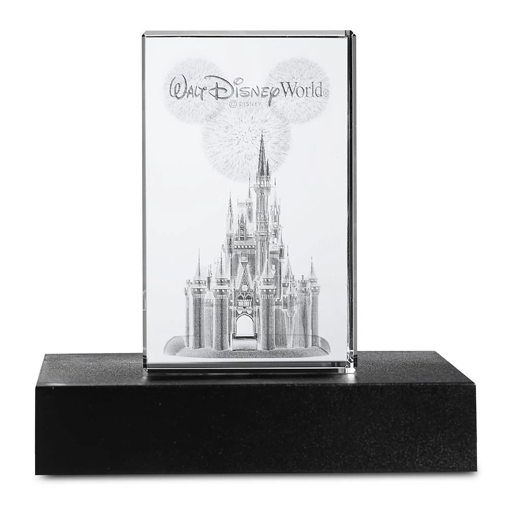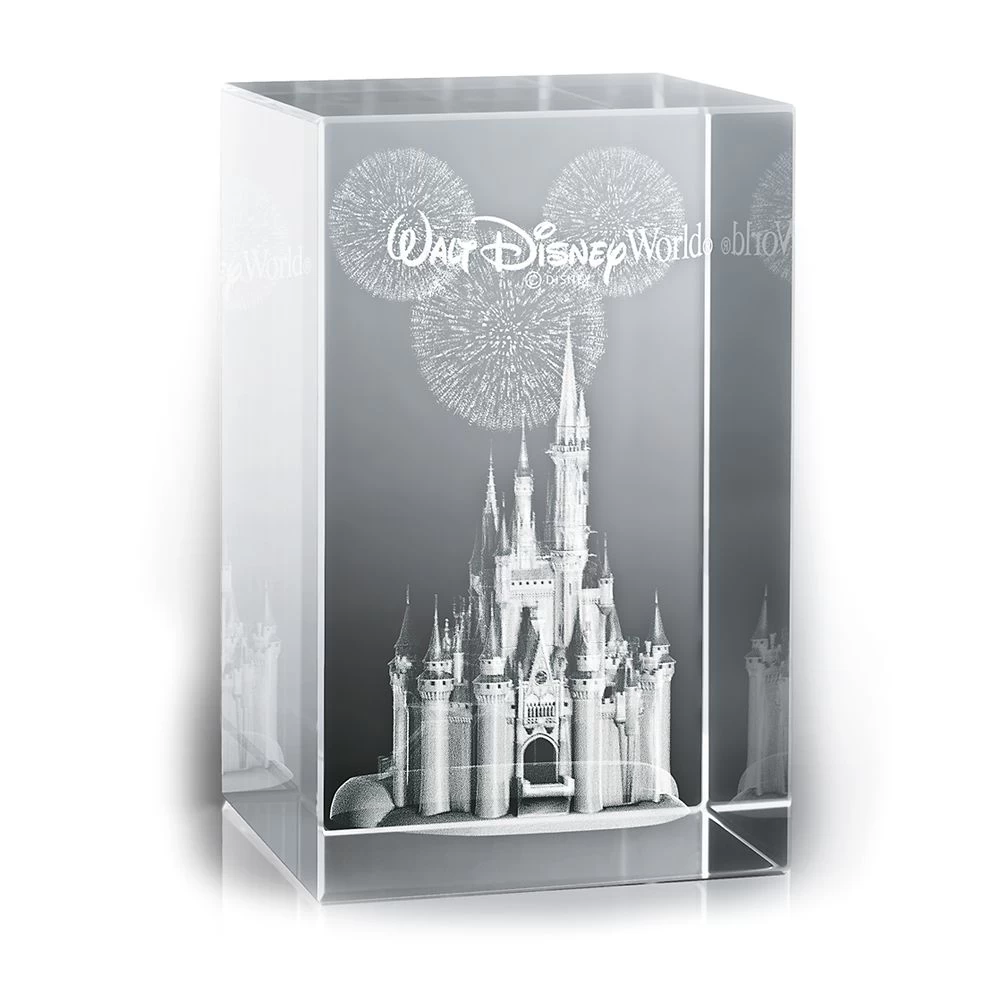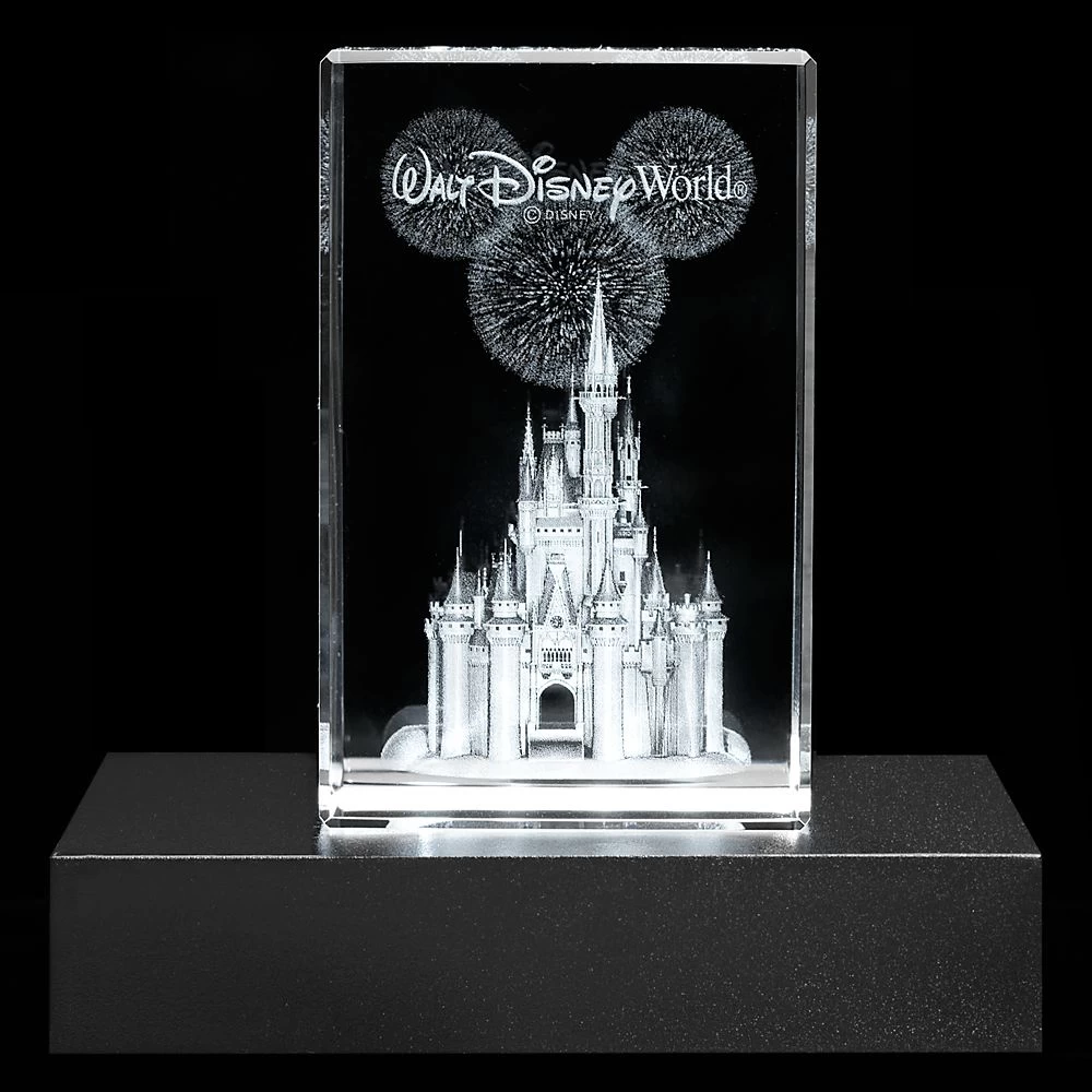 A Mickey icon firework explodes over Cinderella Castle in this ”magical” crystal cube. The 3-D laser engraving process renders the ghostlike Castle within in incredible detail. Place on the Light-Up Base* to get the full effect.