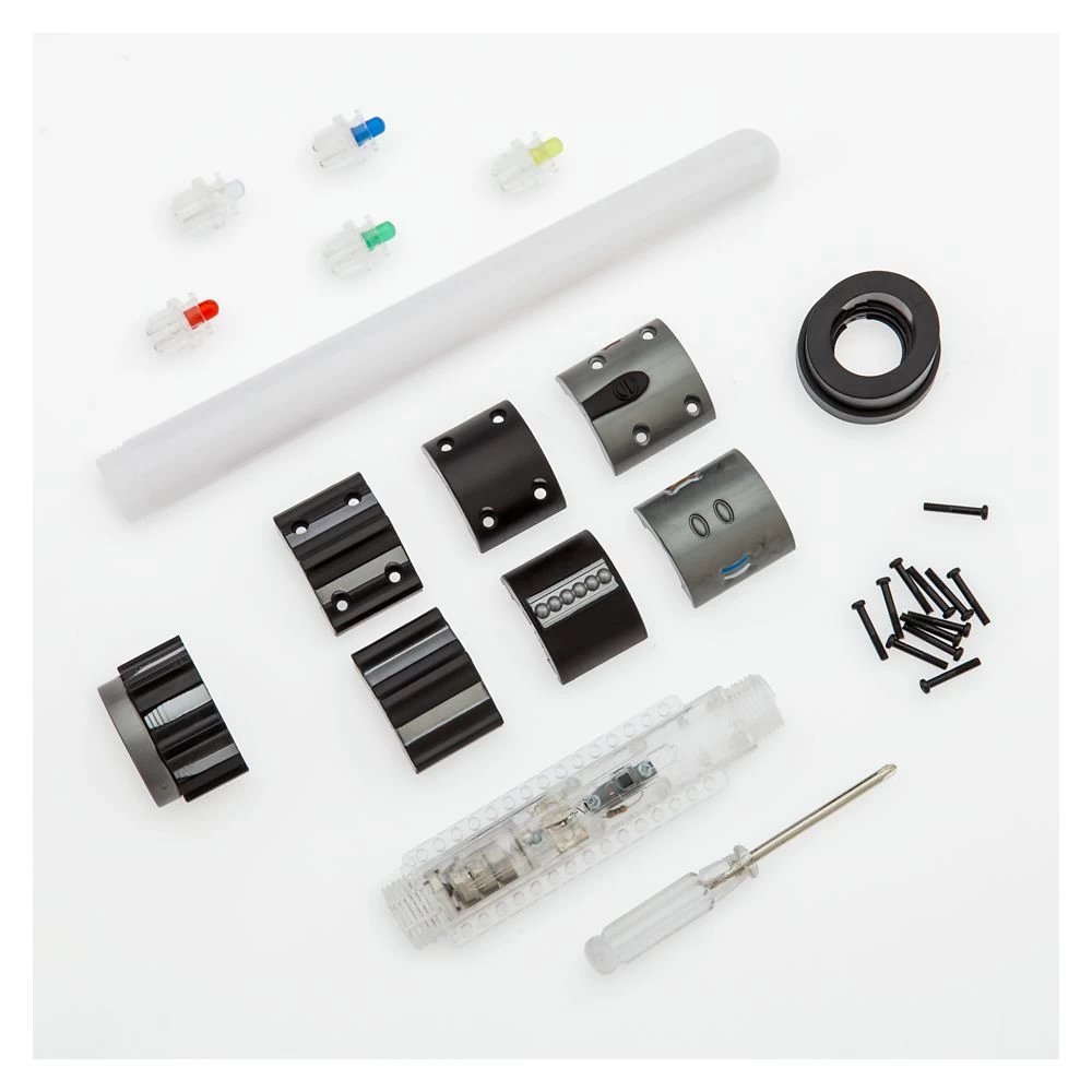 - Includes nine plastic hilt pieces, blade, five LED lights, screws and screwdriver