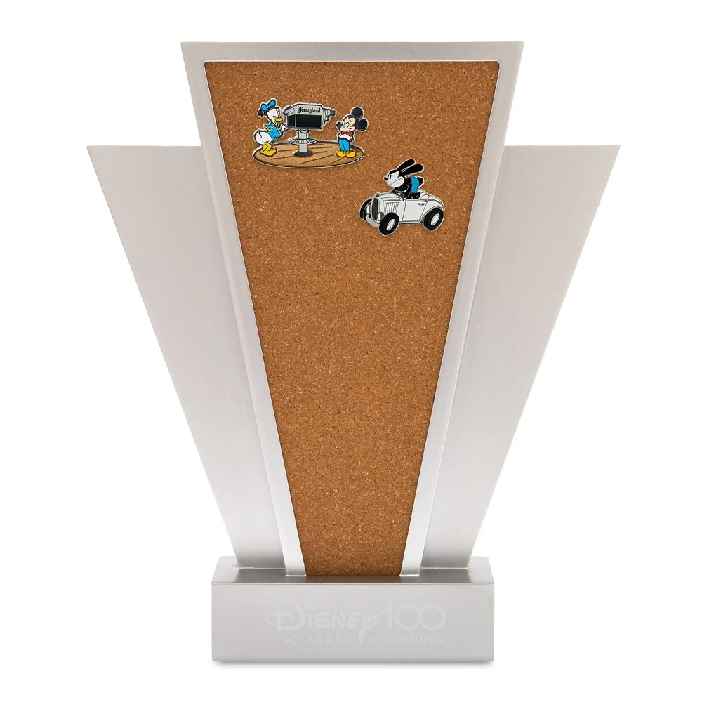 Disney Pin enthusiasts can showcase their collection of platinum-finish keepsakes on this stylish display with ”cork” board backer and shimmering Disney100 base plate.