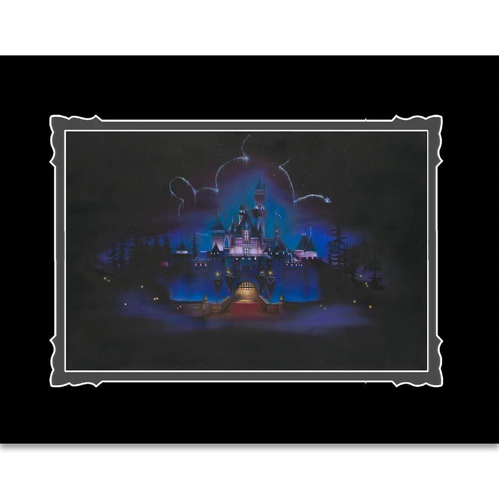To mark Disneyland Gallery’s exhibition celebrating the Disney Theme Parks castles, Noah created ”While Everyone Sleeps.” In this deluxe print, Tinker Bell sprinkles pixie dust around Sleeping Beauty Castle in the outline of Mickey.