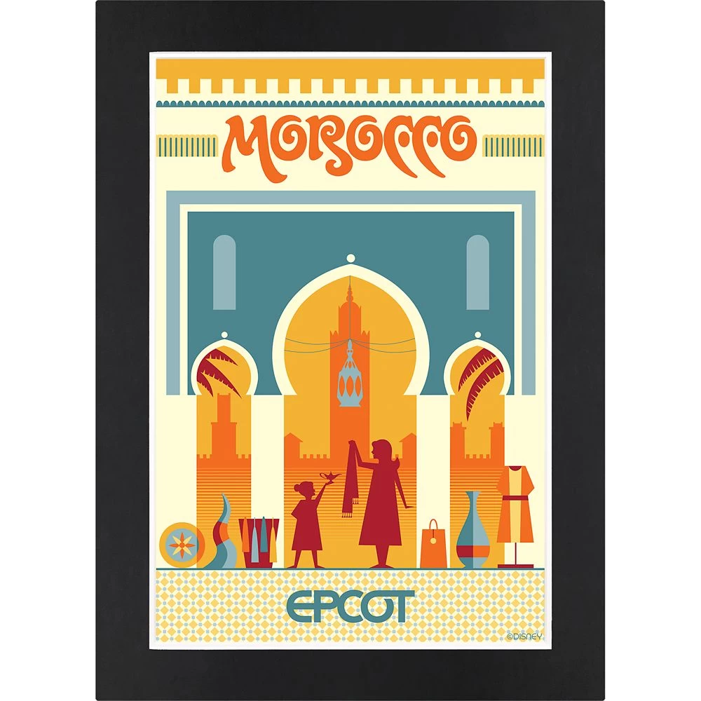 Though all of the designs and concepts for the Morocco Pavilion were created by Walt Disney Imagineering, the actual artwork and decorations were produced by Moroccan artisans who worked onsite for over six months, adding to the authenticity of the World Showcase pavilion. Created by artist Eric Tan, this print features the pavilion’s replica of the Bab Bou Jeloud gate in the city of Fez and the bustling marketplace to which it leads.