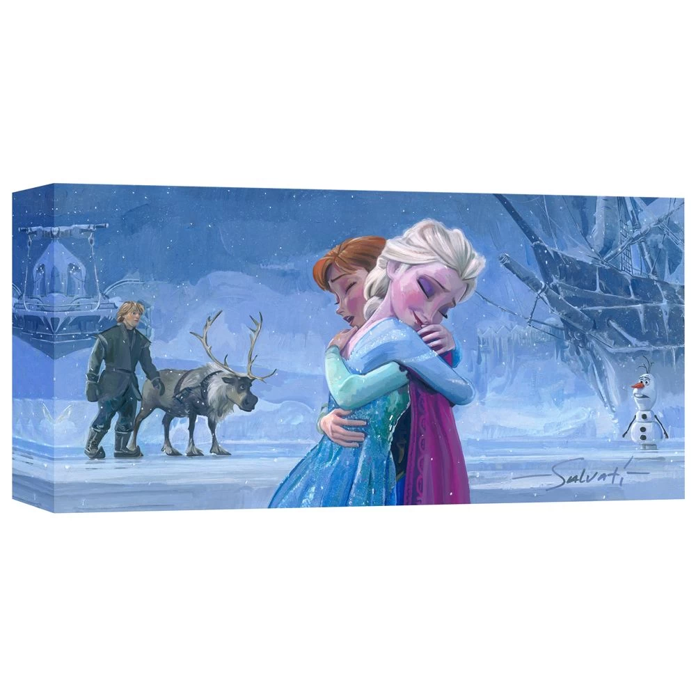 Sisters Elsa and Anna share a tender embrace as Kristoff, Sven, and Olaf look on in this limited edition artwork. Inspired by Frozen, ”The Warmth of Love” was created by Jim Salvati and is part of the Treasures on Canvas Collection.