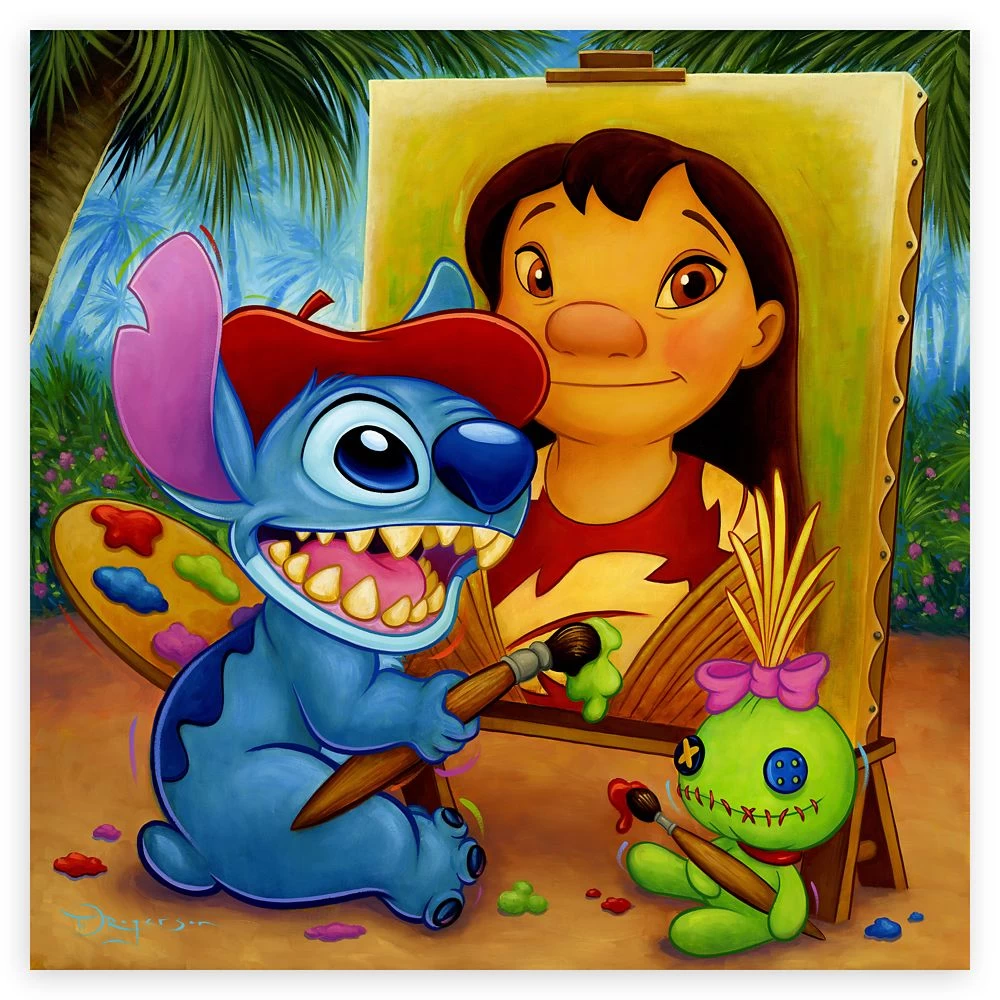 The talented Stitch shows off his artistic skills with his portrait of Lilo in this limited edition giclée by Tim Rogerson. Inspired by Disney’s Lilo & Stitch, ”The Mona Lilo” includes Scrump the Doll and comes gallery wrapped on canvas.