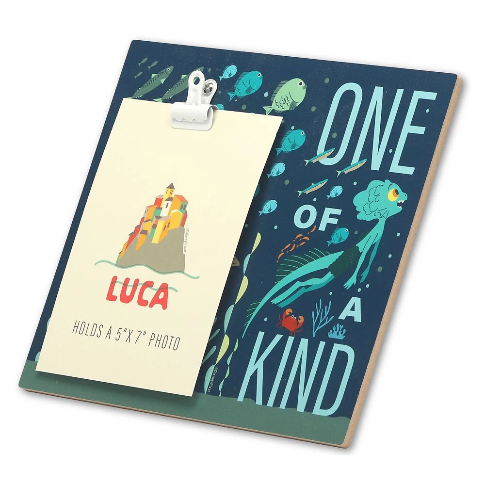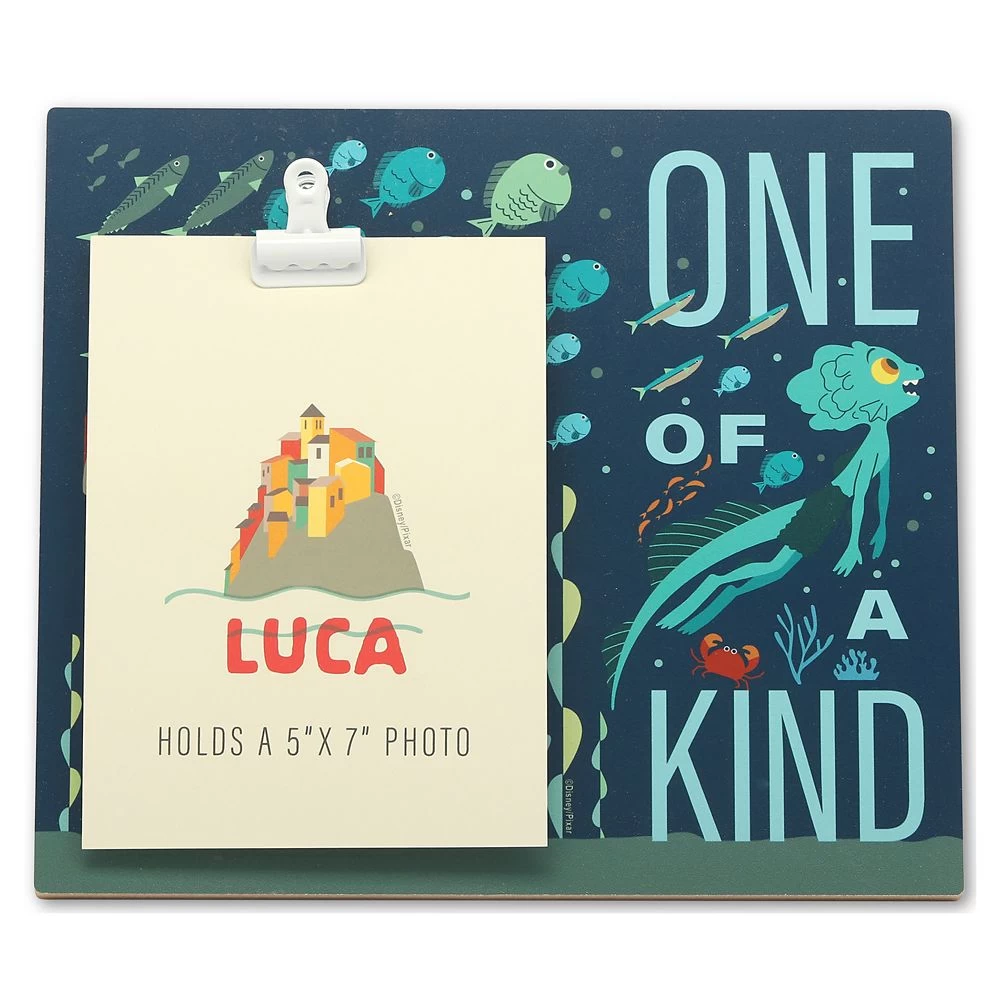 Remember the best summer ever and the Disney and Pixar film Luca with this colorful frame. Featuring sea monster Luca surrounded by fish and other aquatic creatures, this frame has a metal clip that holds a 5” x 7” vertical photo.