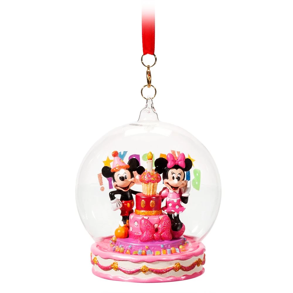 Mickey and Minnie are the cutest pair of cake toppers as the couple come together to wish a ”Happy Birthday” with this celebratory ornament. The figural design features the pair inside a clear glass dome that sits on the colorful base.