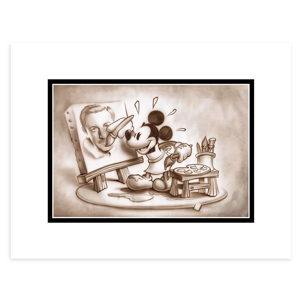 Mickey shows off his creative talents with a painting of Walt Disney, the man who brought Mickey to life in 1928’s Steamboat Willie. This deluxe print of ”A Stroke of Genius” by artist Noah is ready to be framed.