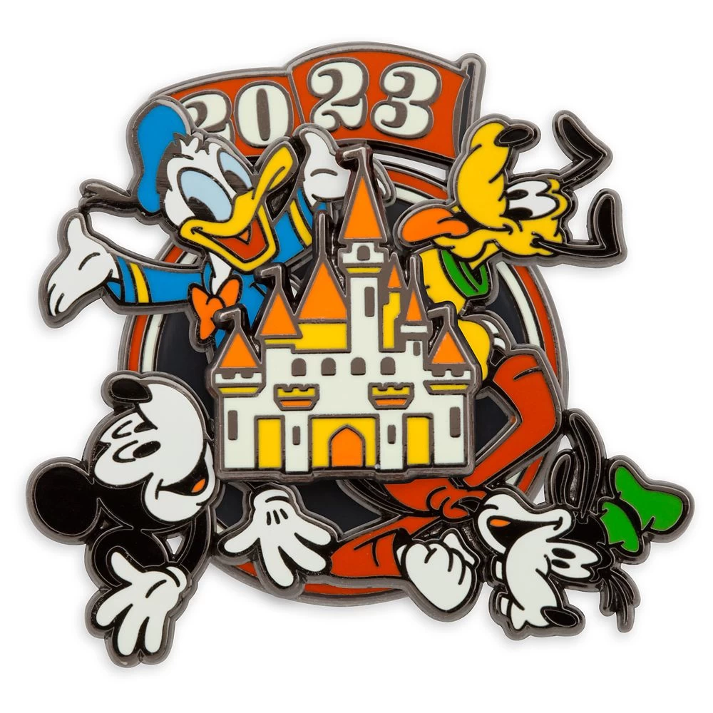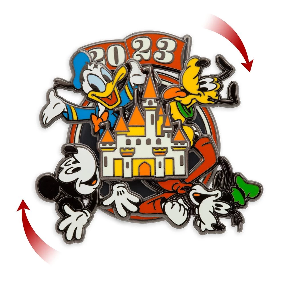 Spin into the New Year 2023 with our sparkling, spinning pin-on-pin design featuring Mickey, Donald, Goofy and Pluto encircling our Fantasyland Castle!