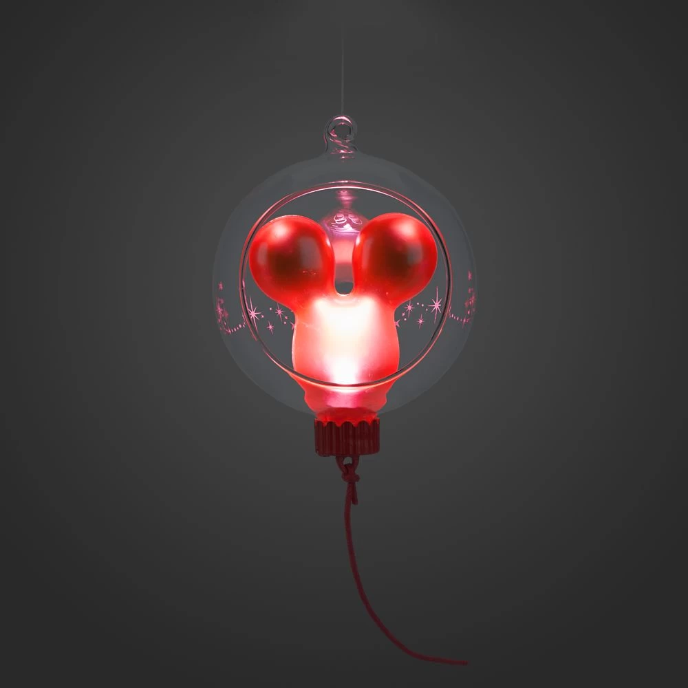 Travel back to Main Street, U.S.A. for a signature Mickey Mouse balloon ornament that lights-up inside a clear glass globe, sure to be a nostalgic highlight of your holiday display.