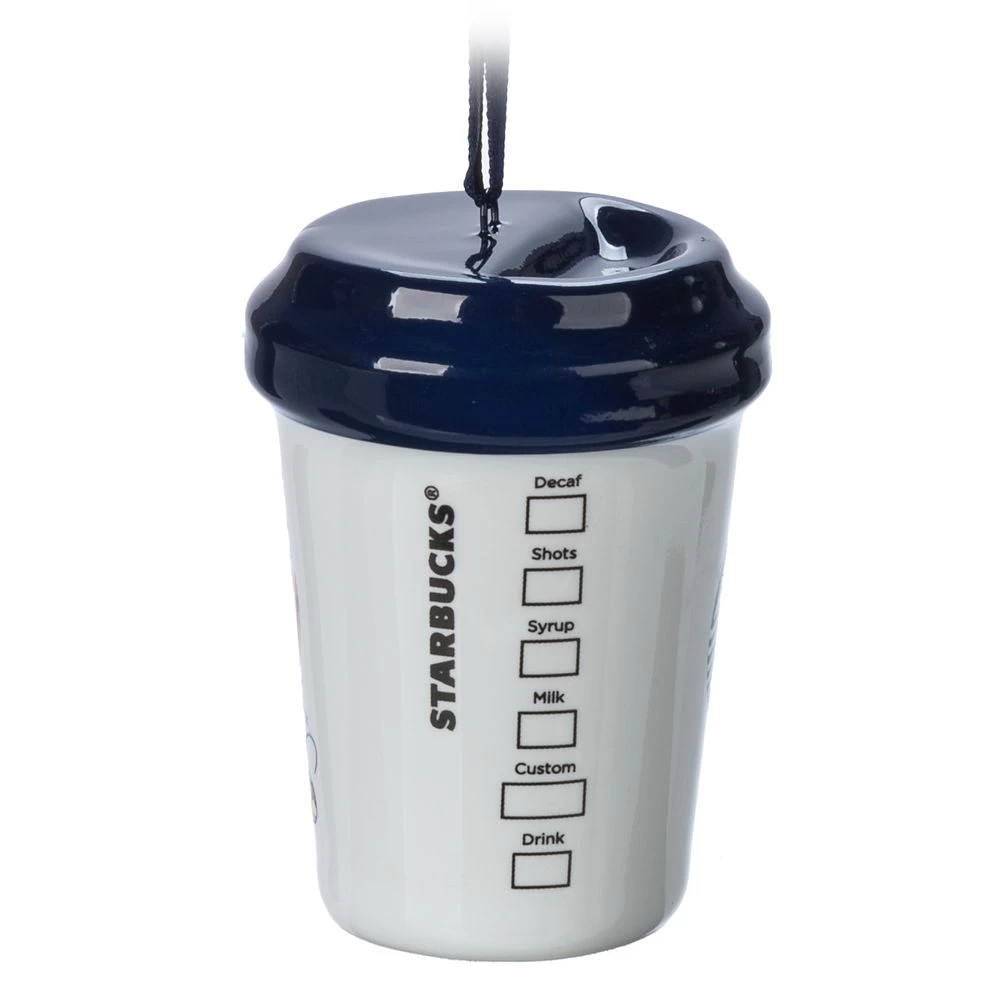 Wake up the holidays with this souvenir ceramic ornament in the form of a miniature Starbucks® carry-out cup with Siren logo, order checklist, and colorful cartoon design of Mickey Mouse at Disney California Adventure.