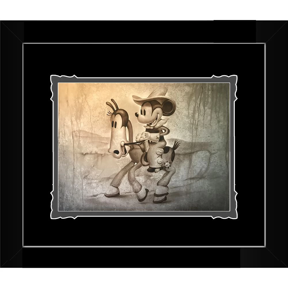 Sheriff Mickey rides into town in this arresting image by renowned artist Noah. The sepia tone gives an aged feel to this elegantly framed deluxe print that comes double matted and ready to hang.