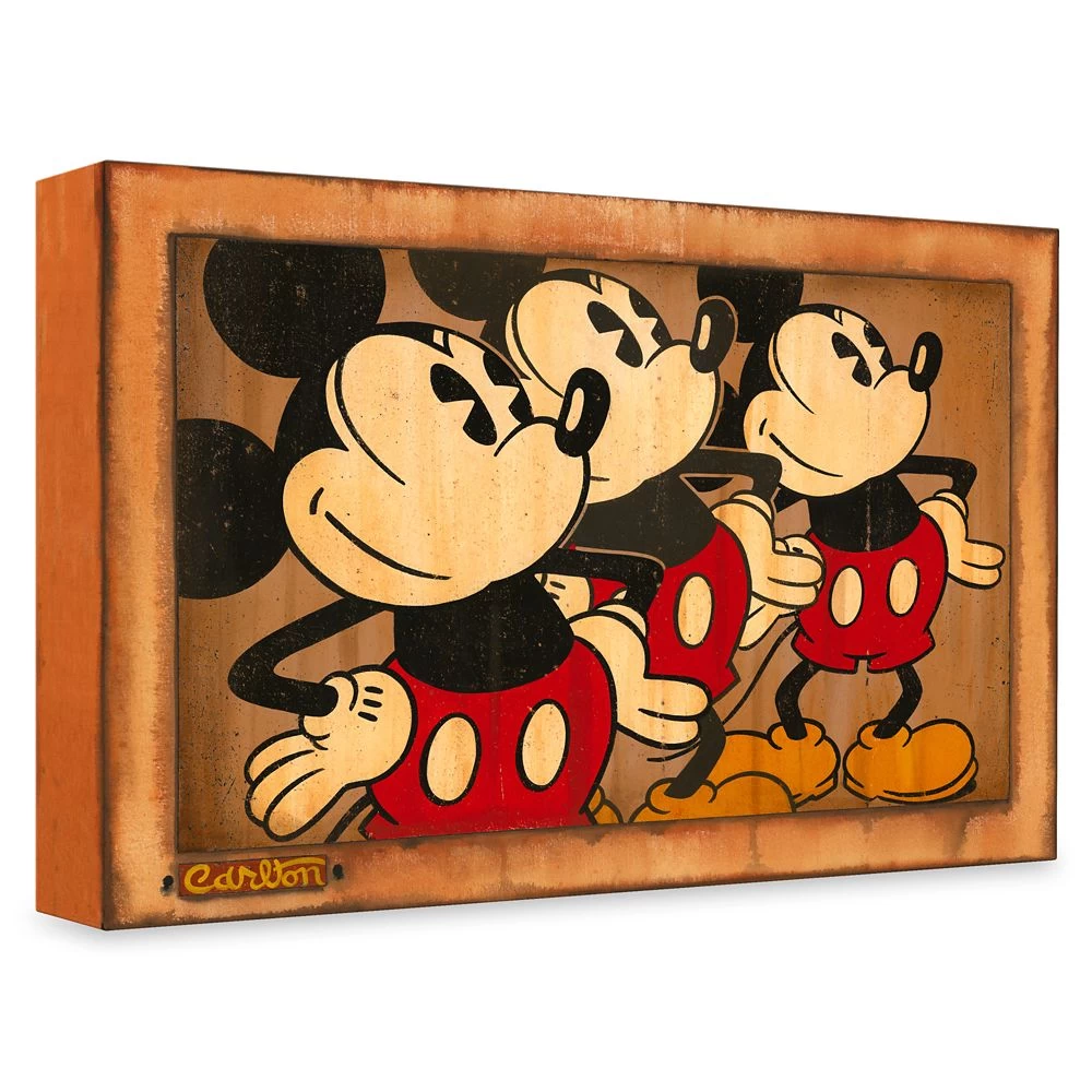 What could be better than a picture of a vintage pie-eyed Mickey? How about three vintage pie-eyed Mickeys! This limited edition work by artist Trevor Carlton features a trio of Mickeys cleverly presented as though an old painting on wood with a trompe l’oeil frame.