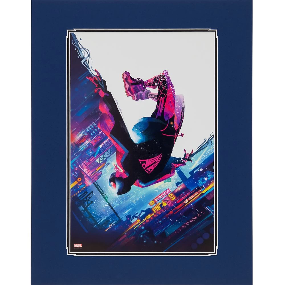 Artist Mateus Manhanini captures the dynamic heroism of Miles Morales in this dramatic artwork. The Spider-Man from the other side of the Spider-Verse is pictured spinning through the nighttime cityscape in this deluxe print from our Artist Series that comes double matted and ready to frame.