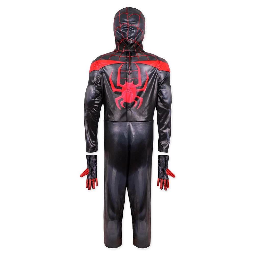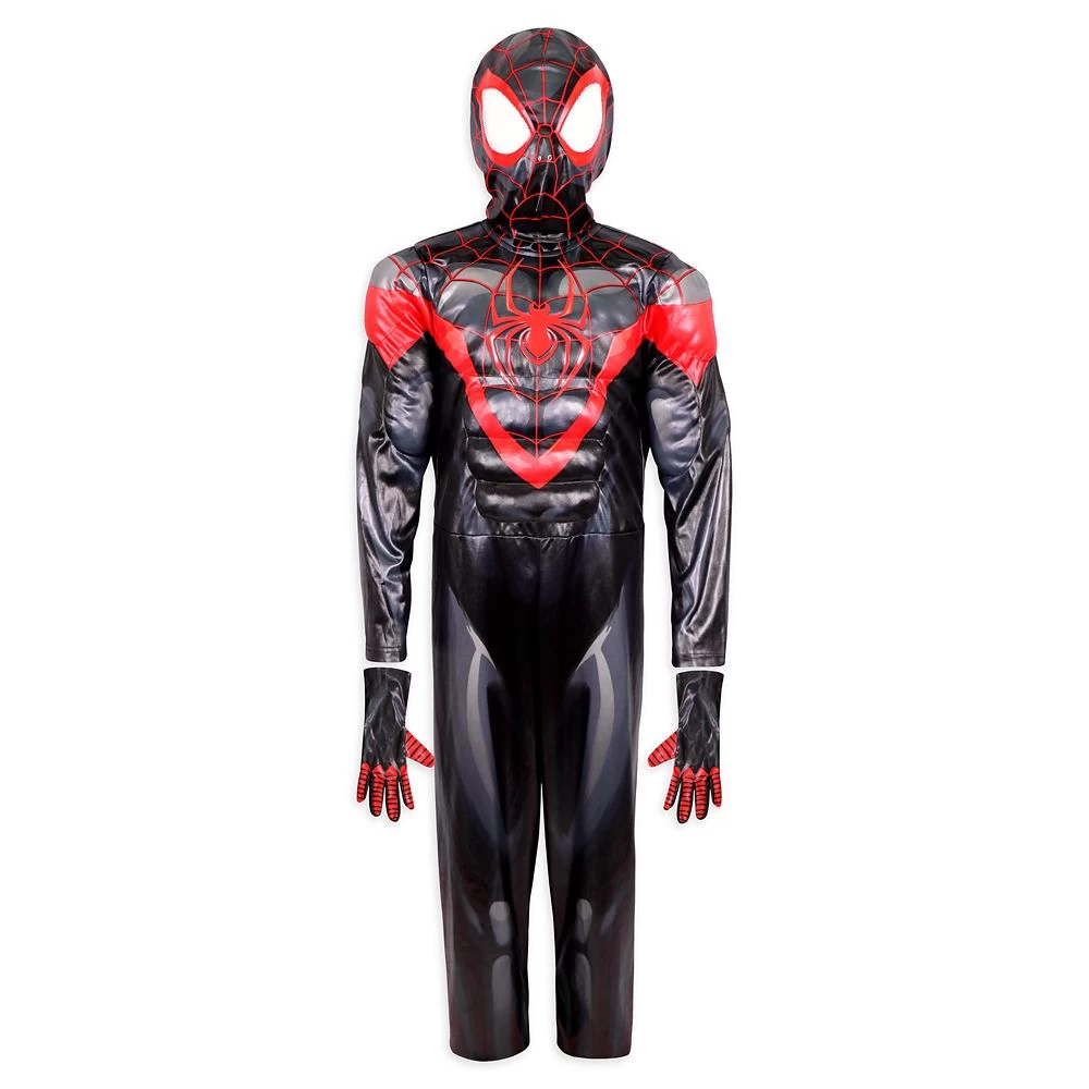 Stylin’ super heroes swing into action wearing this high-tech Spider-Man costume ensemble featuring muscled bodysuit with webbed print, cowl mask, and gloves in the style of Miles Morales, star of Spider-Man: Into the Spider-Verse.