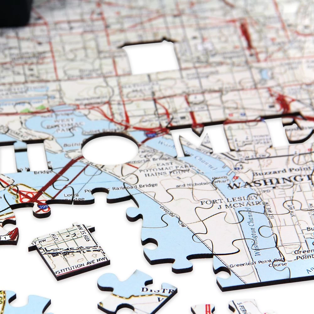 Explore your local area from the comfort of your home with this personalized National Geographic My Town Puzzle. Each jigsaw is custom made of wood, providing greater durability. Simply provide your address and zip code and, using US Geological Survey (USGS) mapping that’s digitally stitched together seamlessly, we create a detailed 300-piece map that covers an area of 7 1/2 miles by 5 miles, with your home at the center.