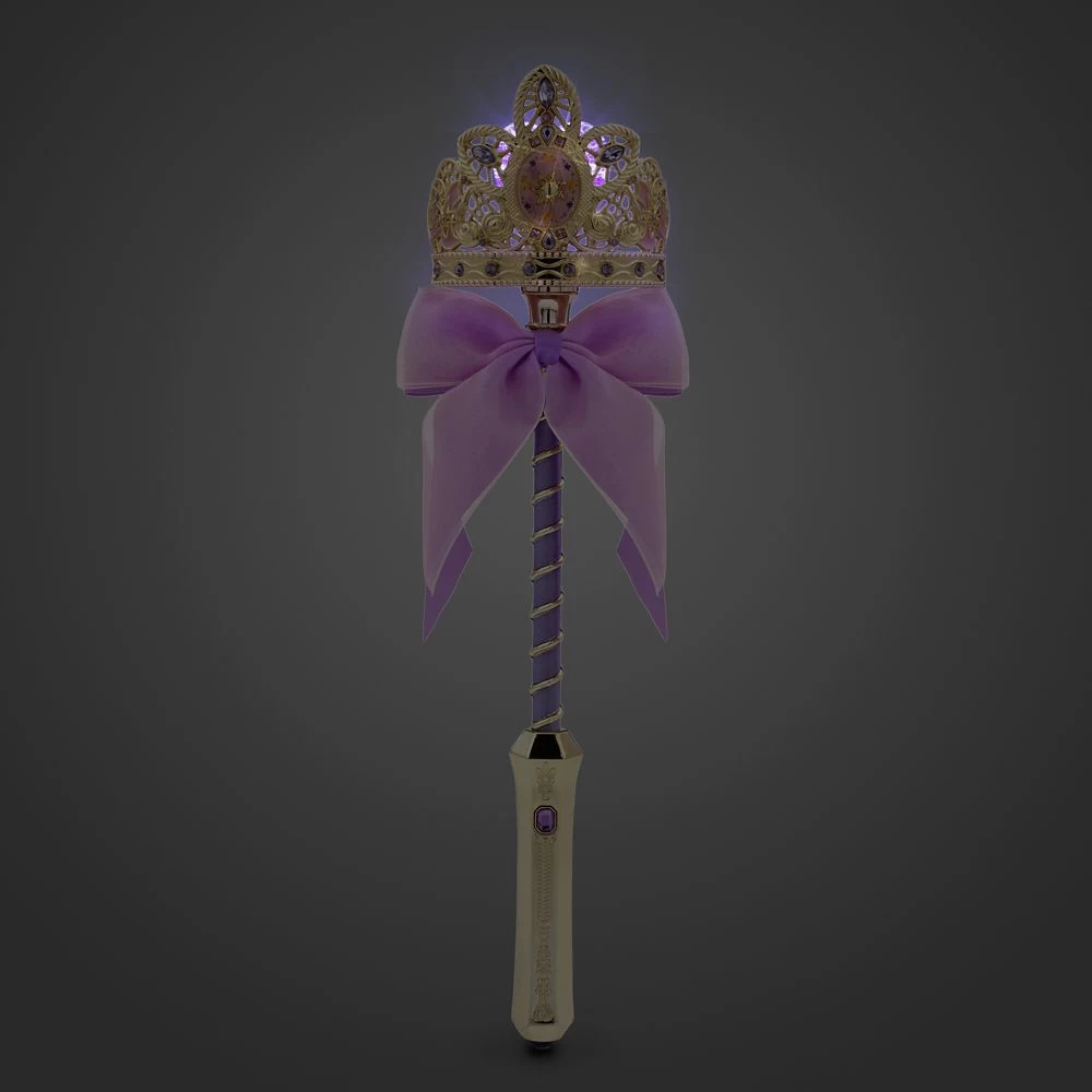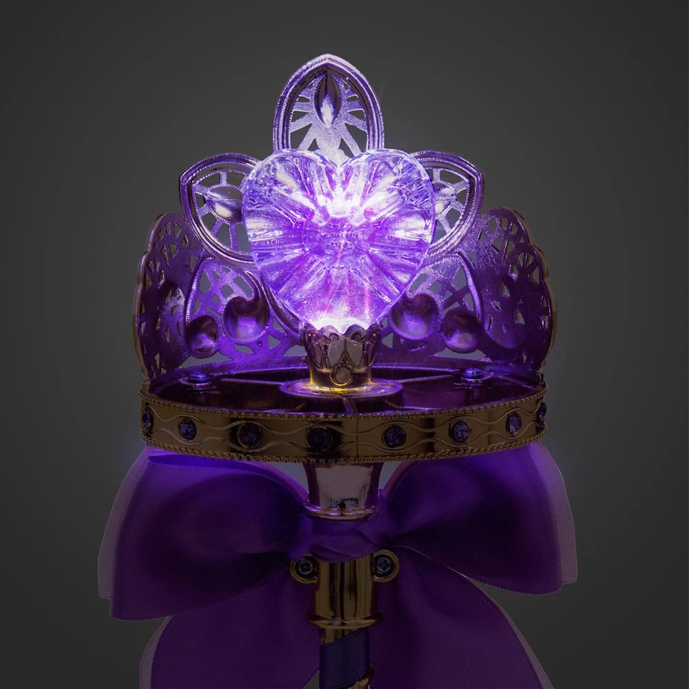 Their lofty ambitions can come true with a wave of their Rapunzel wand. Topped by a bejeweled metal crown with sculpted sun cameo, this golden scepter, with two light-up settings, makes a magical Disney Princess costume accessory.