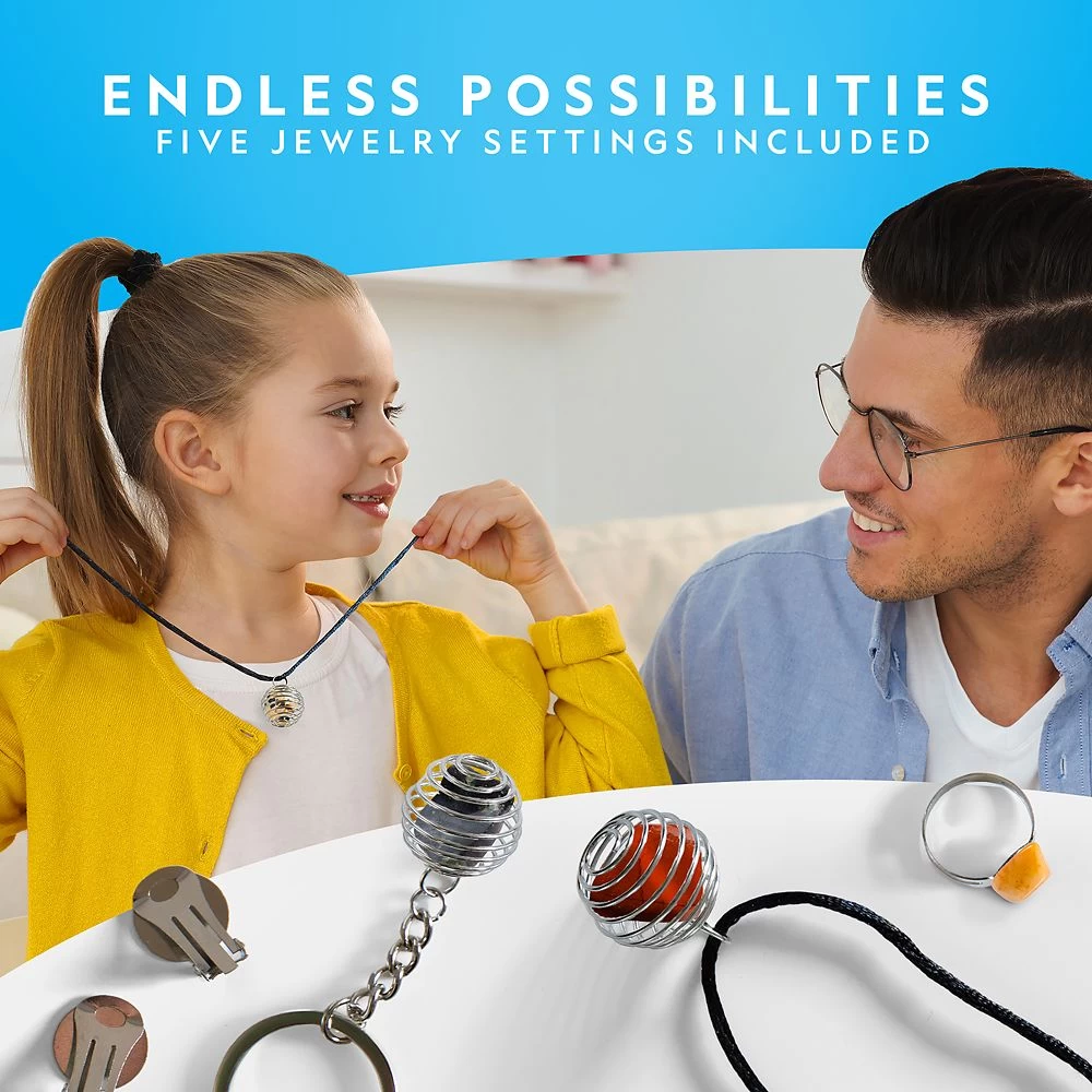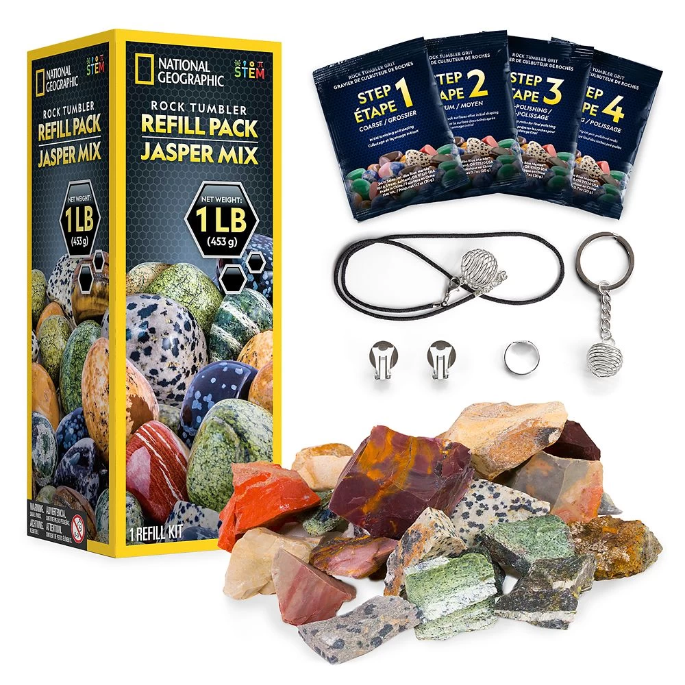 This refill pack contains a mixture of semi precious jasper from around the world. Your young scientist will have a blast running these pieces through the rock tumbler (sold separately) to transform them from rough rocks into polished gems! This set includes jewelry settings so they can create their own ring, earrings and necklace with the shiny stones.