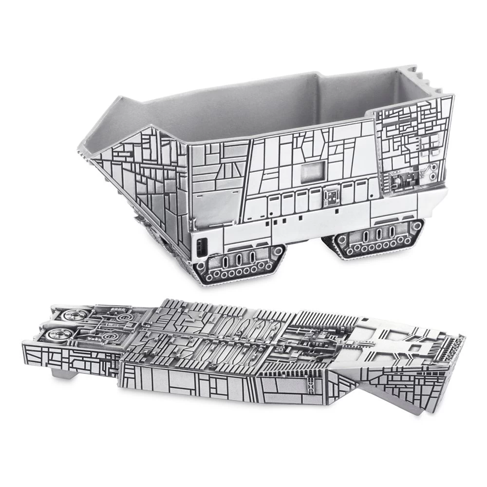 Protect your valuables in the fortress-like safety of this Sandcrawler Keepsake Box. Finely detailed in pewter by Royal Selangor, this approximately 1/265 scale reproduction of the Jawas’ enormous Sandcrawler from Star Wars opens at a cleverly disguised seam so you can hide scavenged treasures of your own.
