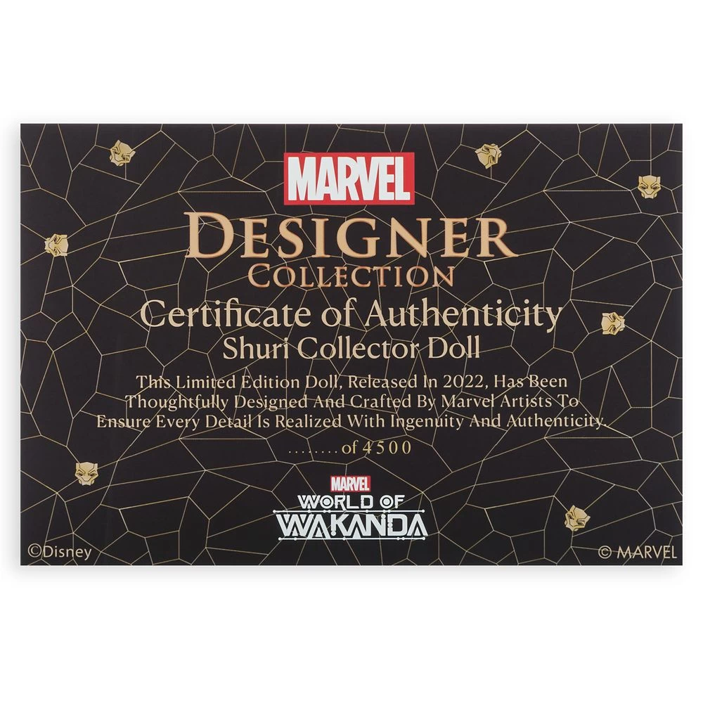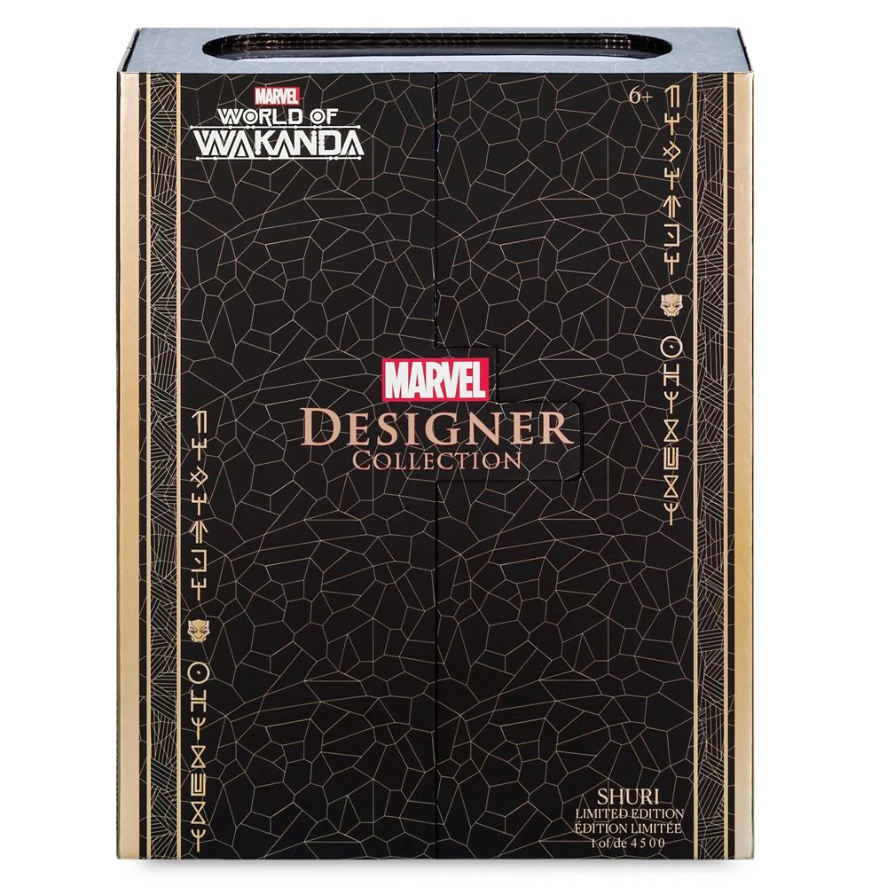 Thoughtfully designed and crafted by Marvel artists to ensure every detail is realized with ingenuity and authenticity, the Marvel Designer Collection proudly presents this limited edition Shuri doll. King T’Challa’s younger sister is featured in her glamorous outfit inspired by what she would wear to a royal Wakandan evening event. Beautifully detailed with exquisite decoration, including dramatic face make-up, Shuri comes with a display stand and is presented in an elaborate gatefold box, making it a must have for collectors.