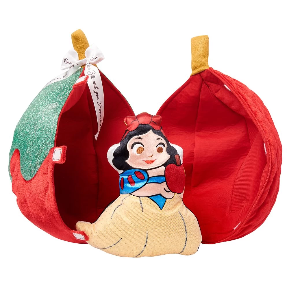 This soft plush features Snow White with embroidered features and glittering skirt on one side, while the Evil Queen offers a poisoned apple on the reverse. The plush comes inside an apple with self-stick fabric closure, bright red on one side and ”dripping” green on the other. Celebrate the 85th Anniversary of Walt Disney’s animated masterpiece Snow White and the Seven Dwarfs with these adorable dolls.
