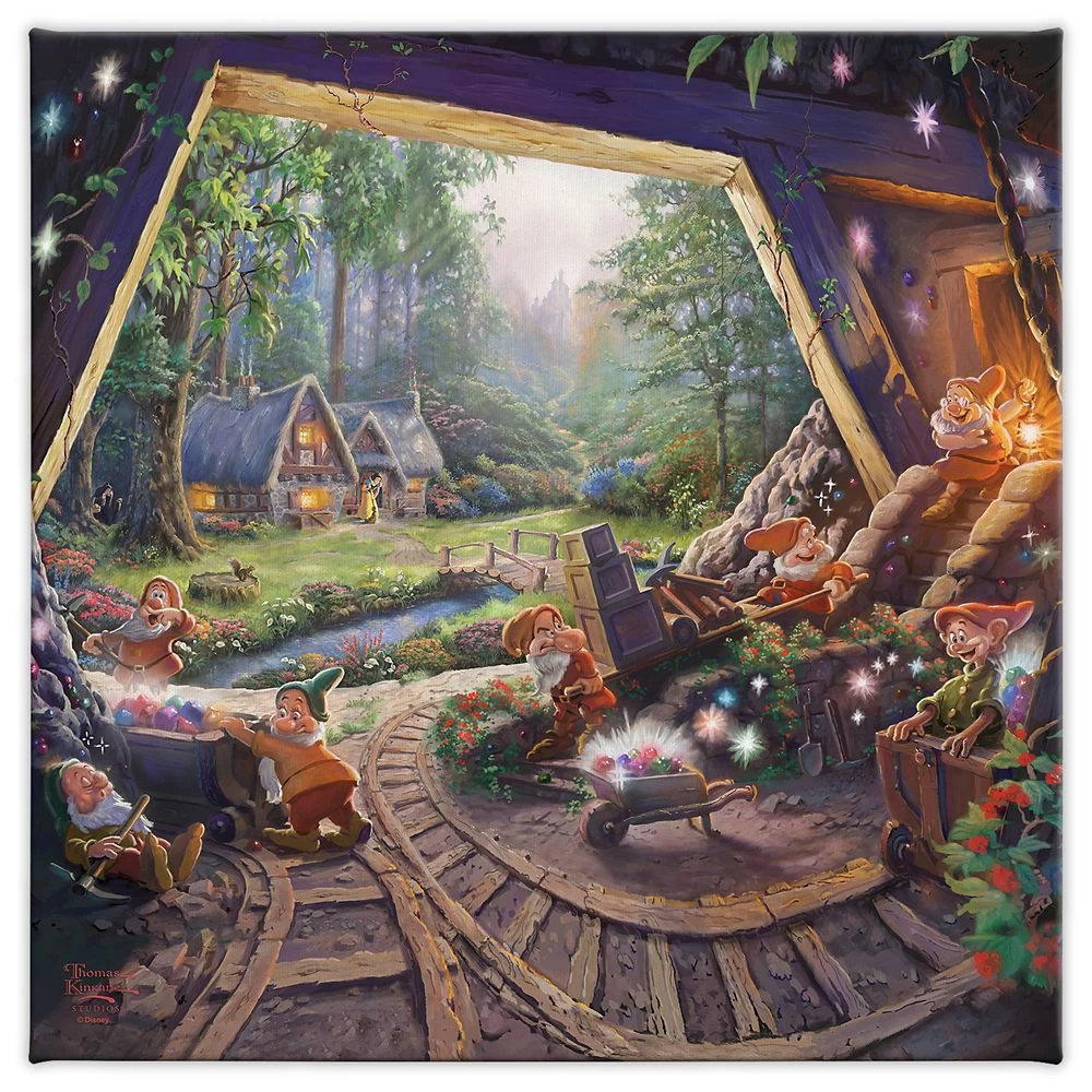 The seven dwarfs busy themselves in the diamond mine while in the background Snow White hasn’t seen the unexpected visitor approaching the cottage. This Gallery Wrapped Canvas by Thomas Kinkade Studios illuminates the dramatic scene in Kinkade’s inimitable ”Painter of Light” styling.