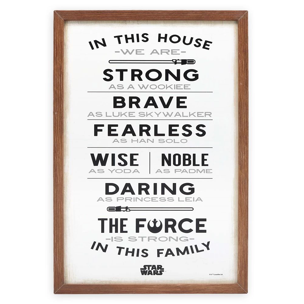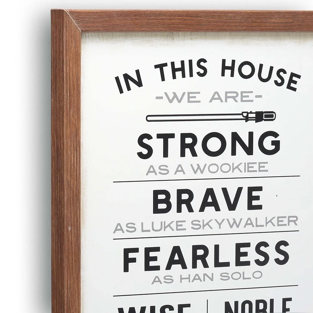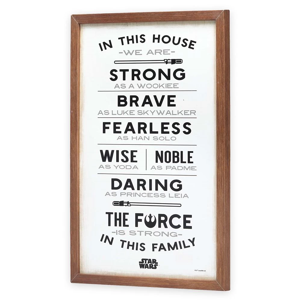 - Features text: ”In this house we are as strong as a Wookiee, as brave as Luke Skywalker, fearless as Han Solo, wise as Yoda, noble as Padme and daring as Princess Leia” and ”The Force is strong in this family”