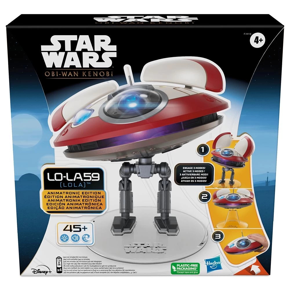 The Star Wars L0-LA59 (Lola) animatronic edition lets your little Star Wars fan bring home a beloved droid companion. This droid toy features design and deco inspired by Star Wars: Obi-Wan Kenobi series on Disney+. Touch the censor on L0-LA59’s head to activate more than 45 different light, sound, and movement combinations through three modes of play. Unlock Companion Mode by attaching L0-LA59’s legs, Hover Mode by attaching her stand, or On the Go Mode by removing her from either base. She even responds to background noises with a series of lights, sounds and movements. She’s the perfect addition to any Star Wars collection.