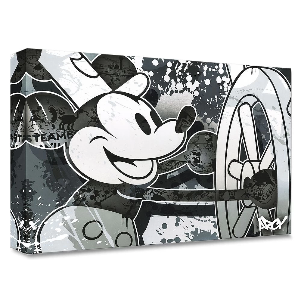 Renowned artist ARCY blends his contemporary splashed street art style with a nostalgic montage inspired by Mickey Mouse’s 1928 movie debut. Our limited edition ”Steamboat Willie” print on canvas comes gallery wrapped and includes a certificate of authenticity.