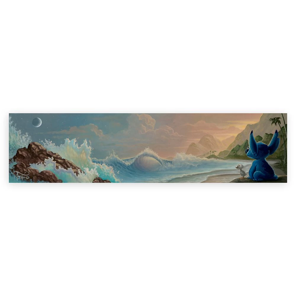 Celebrate the art and legacy of Disney Animation with this limited edition hand-signed and numbered canvas print featuring Stitch and a duckling friend at the seashore. ”Aloha Sunset” by Jared Franco is gallery wrapped and hand-embellished with acrylic painted accents.