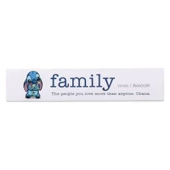After befriending Lilo, Stitch learns the importance of ”family.” This touching wall décor features Experiment 626 clutching Scrump the Doll, providing a perfect example of the dictionary definition of ”family” that accompanies them on this wood plank.