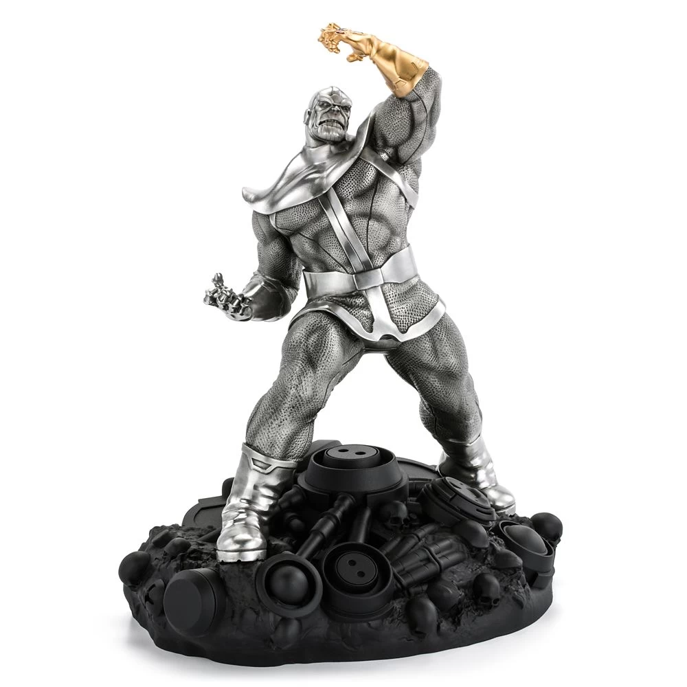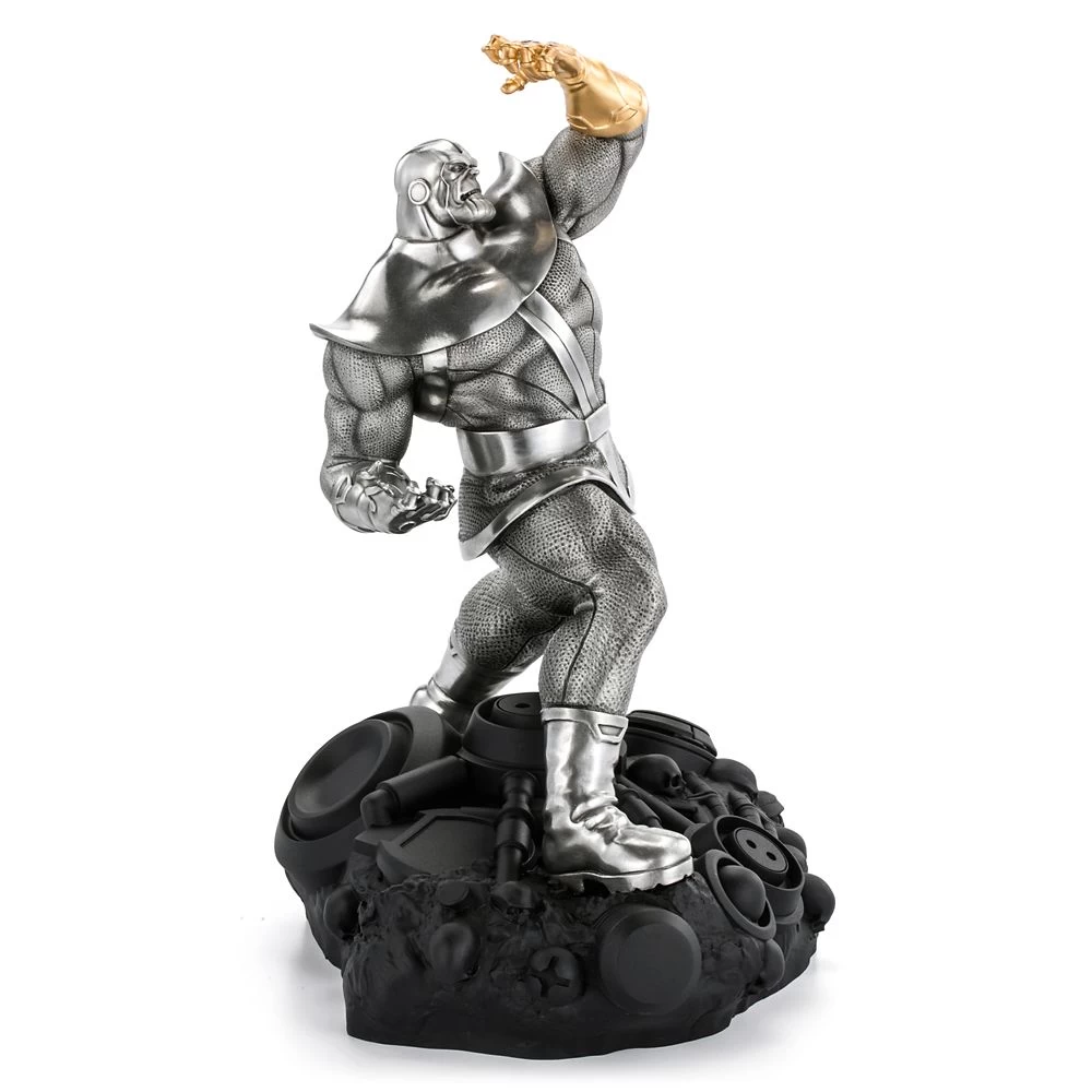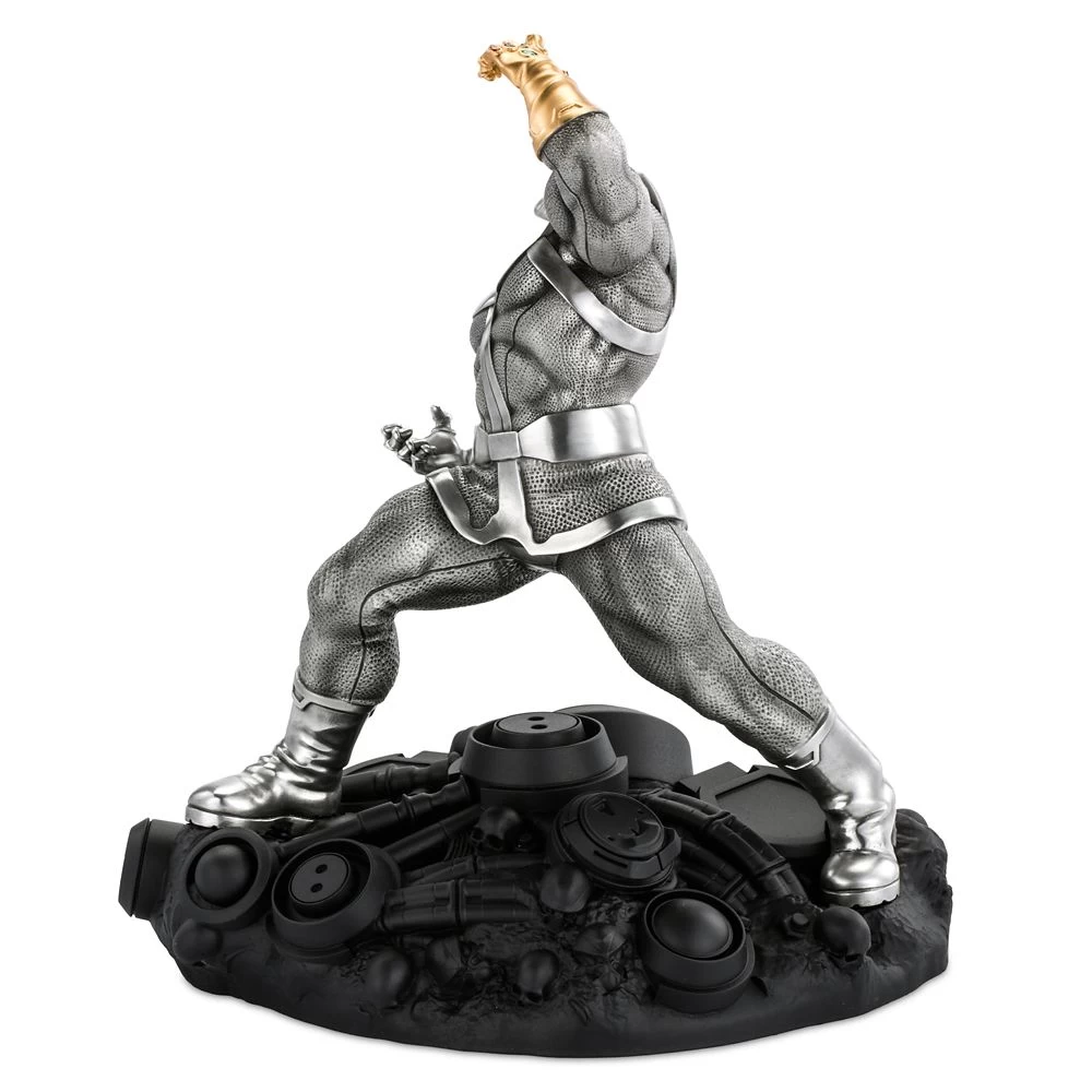 Reveling in the omnipotence bestowed by the six Infinity Stones set in his gauntlet, Thanos harnesses their combined power to annihilate half the life in the universe, in his obsessive need to prove his love to Mistress Death. Spectacularly realized, the pewter figurine stands atop a bonded porcelain scenic base, his 24K gilded gauntlet studded with faceted crystals and held aloft in triumph.