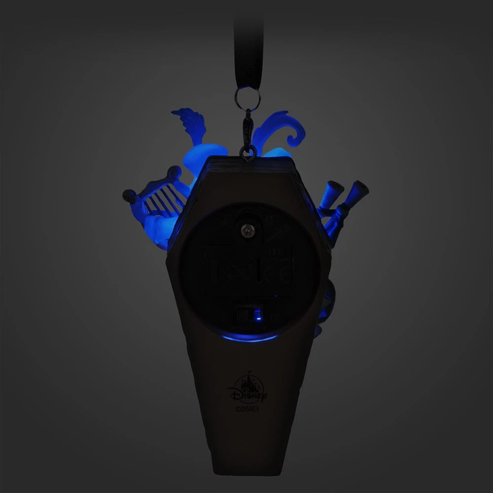 Two grim, grinning members of The Haunted Mansion‘s musical quintet, The Phantom Five, appear on this sculpted casket ornament and are happy to hang around your house for awhile playing the bagpipe and harp. ”Harpy Holidays!”