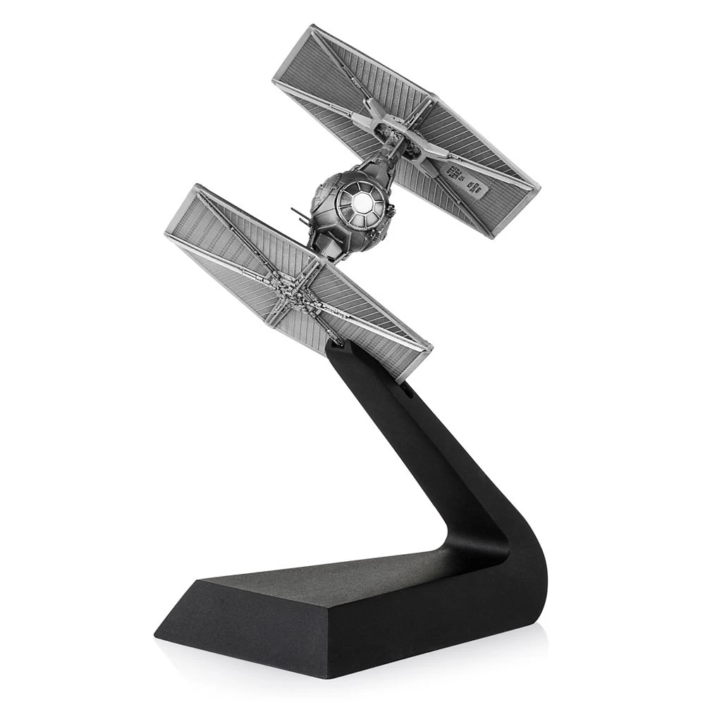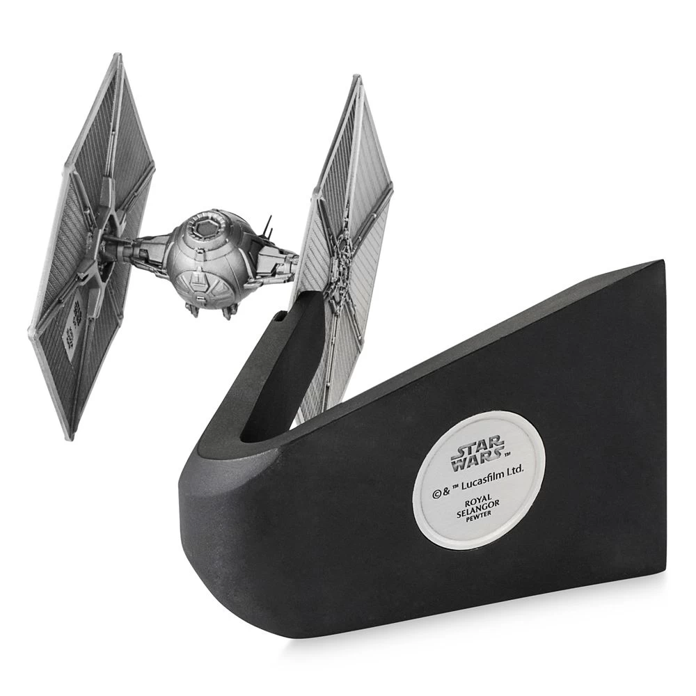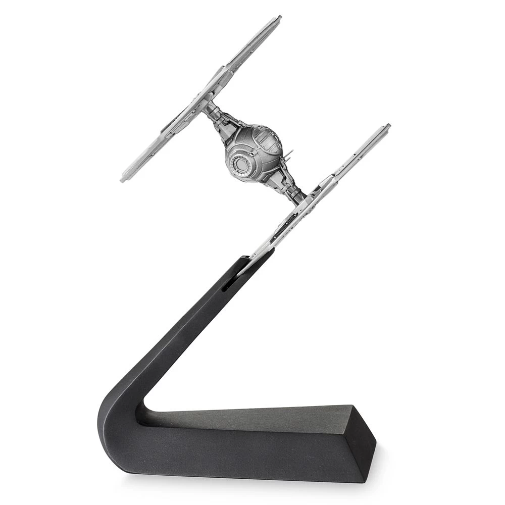 The trademark tactical fighter of the Imperial fleet, designed to go head-to-head with Rebel X-Wings, consists of little more than a cockpit and engine, sandwiched between solar panels. Despite this, it proves frighteningly lethal in dogfights. Fashioned from pewter by Royal Selangor, and reproduced in startling detail, the 1/72 scale TIE Fighter model sits at a sharp attack angle atop the stand, the distinctive howl of its engine almost palpable.