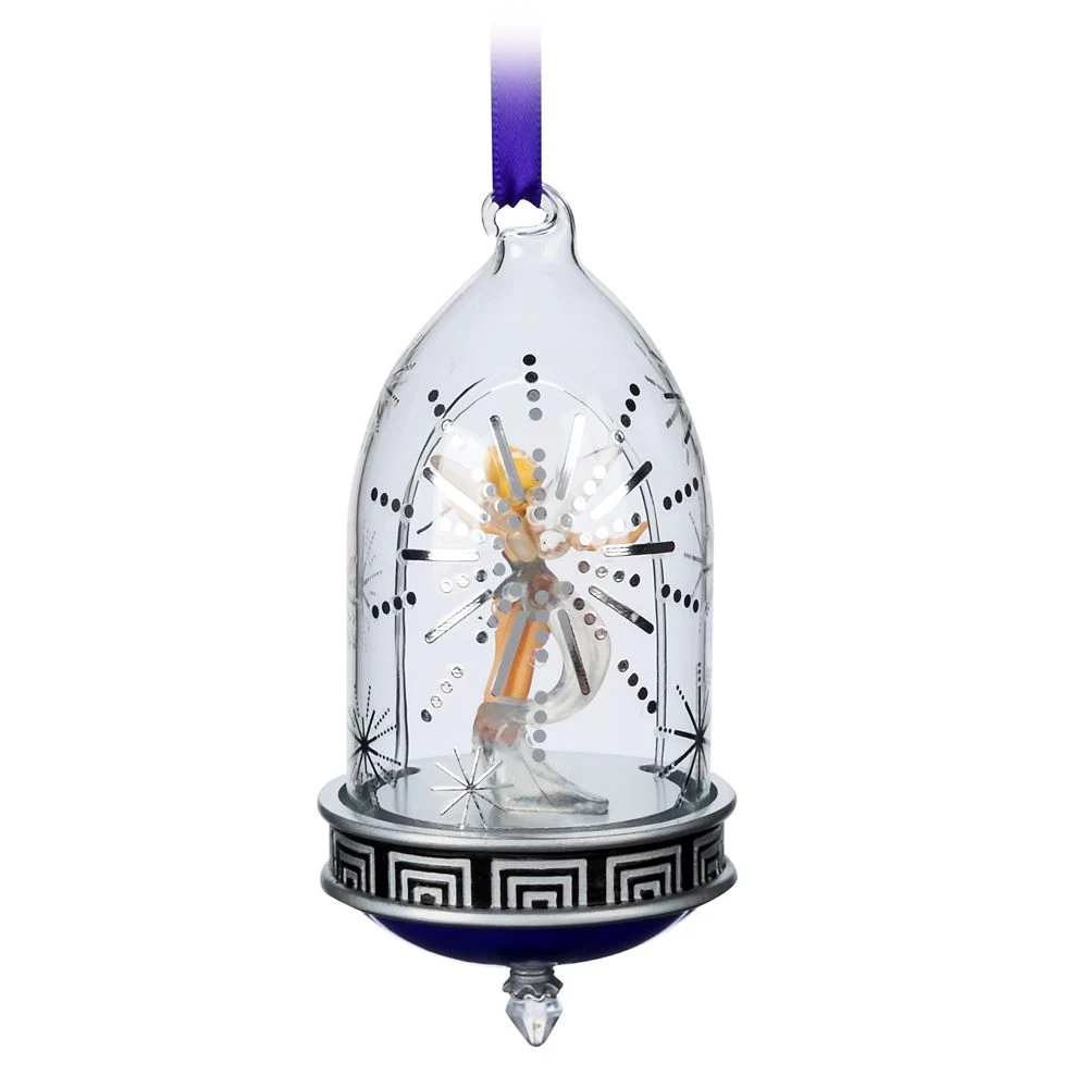 Dream of faraway fantasy worlds while gazing at our glittering glass Tinker Bell ornament. In her classic pose, a sculpted Tink figurine is placed within a pixie-dusted clear bell dome to peer from the picture window into your home décor.