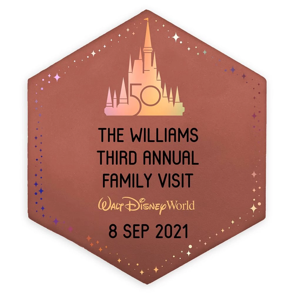 Celebrate the 50th anniversary of Walt Disney World by creating your very own personalized Commemorative Legacy Paver. Inspired by the bricks originally featured at Magic Kingdom Park, this souvenir 8” clay replica* features an iridescent screen print of the Walt Disney World 50th Anniversary logo.