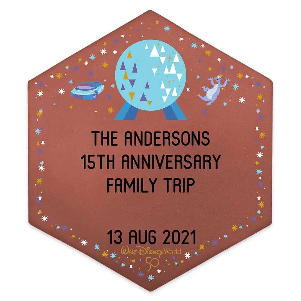 Celebrate the 50th anniversary of Walt Disney World by creating your very own personalized Commemorative Legacy Paver. Inspired by the bricks originally featured at Magic Kingdom Park, this souvenir 8” clay replica* features artwork of Spaceship Earth from Disney’s EPCOT park.